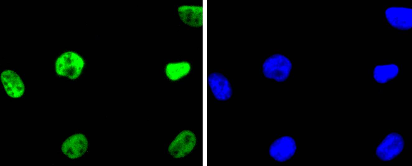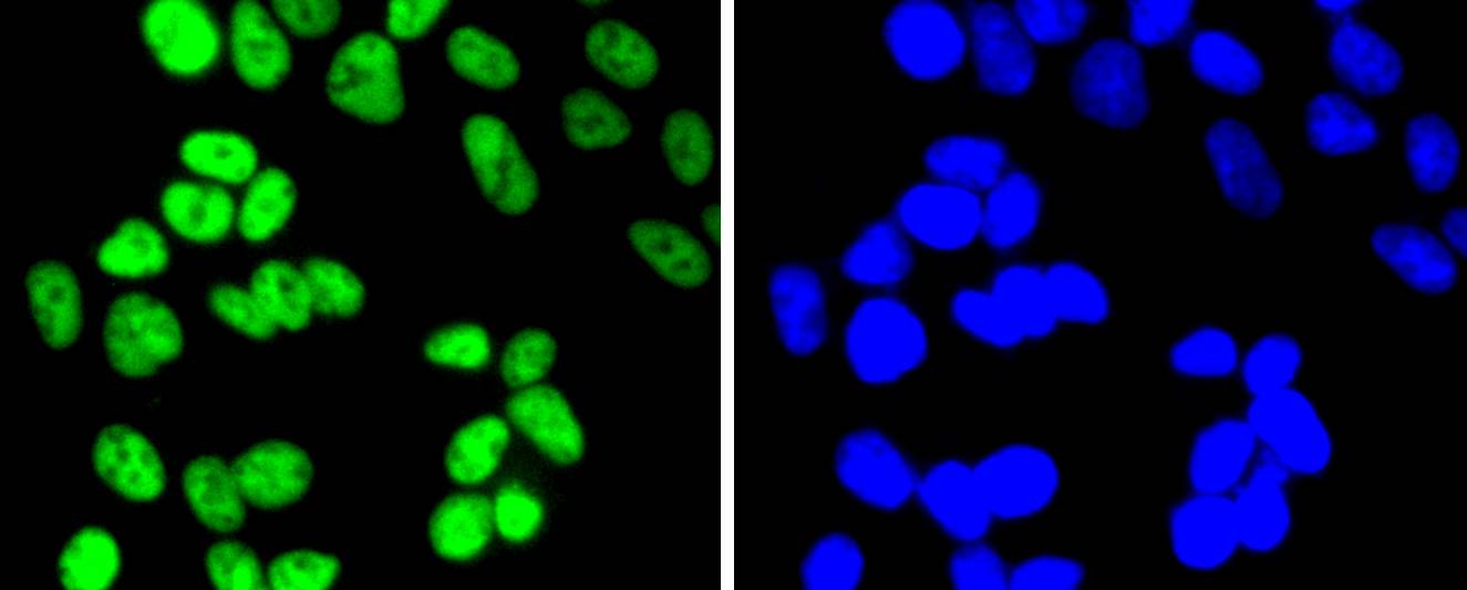 ICC staining HDAC2 in Hela cells (green). The nuclear counter stain is DAPI (blue). Cells were fixed in paraformaldehyde, permeabilised with 0.25% Triton X100/PBS.