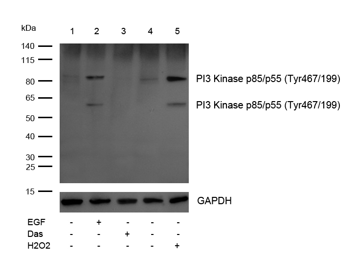 All lanes : PI3 Kinase p85/p55 (phospho-Tyr467/199) Antibody at 1/500 dilution Lane 1 : MCF-7 whole cell lysates Lane 2 : MCF-7 treated with 100ng/mL EGF for 15 min whole cell lysates Lane 3 : MCF-7 treated with 200nM Dasatinib for 24hr whole cell lysates Lane 4 : JK whole cell lysates Lane 5 : JK treated with 2mM H2O2 for 15 min whole cell lysates Lysates/proteins at 20 µg per lane. Secondary All lanes : Goat Anti-Rabbit IgG H&L (HRP) at 1/20000 dilution Predicted band size: 55 kDa Observed band size: 60,85 kDa Exposure time: 9 seconds