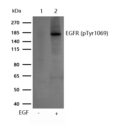 特异性Phospho-EGFR (Y1069) Polyclonal Antibody detects endogenous levels of EGFR protein only when phosphorylated at Y1069.