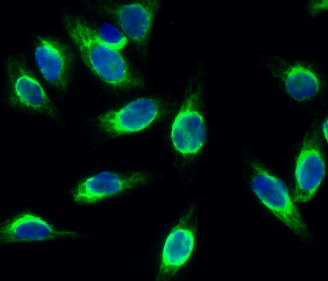 Immunofluorescence analysis of Hela cell. Antibody(green) was diluted at 1:200(4° overnight). 2, Goat Anti Rabbit Alexa Fluor 488 was diluted at 1:1000(room temperature, 50min). 3 DAPI(blue) 10min.
