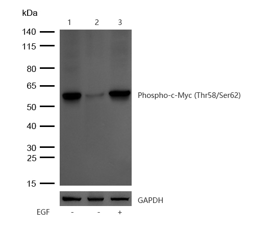 All lanes : c-Myc (Phospho-T58/S62) Rabbit mAb at 1/1k dilutionLane 1 : C6 whole cell lysatesLane 2 : 293T whole cell lysatesLane 3 : 293T treated with 100ng/ml EGF for 20min whole cell lysatesSecondaryAll lanes : Goat Anti-Rabbit IgG H&L (HRP) at 1/20000 dilutionPredicted band size: 49 kDa Observed band size: 57 kDaExposure time: 9 seconds