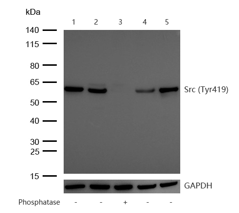 All lanes : Src (Phospho-Tyr419) Rabbit mAb at 1/1k dilutionLane 1 : MCF7 whole cell lysatesLane 2 : HT-1080 whole cell lysatesLane 3 : HT-1080 treated with Lambda Protein Phosphatase for 30min whole cellLane 4 : Mouse Bladder lysatesLane 5 : Rat Bladder lysatesLysates/proteins at 20 µg per lane.SecondaryAll lanes : Goat Anti-Rabbit IgG H&L (HRP) at 1/20000 dilutionPredicted band size: 60 kDa Observed band size: 60 kDaExposure time: 5 seconds