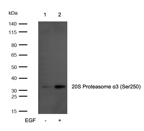 All lanes : 20S Proteasome α3 (Phospho-Ser250) Antibody at 1/500 dilution Lane 1 : 3T3 whole cell lysates Lane 2 : 3T3 treated with 200ng/ml EGF for 30 minutes whole cell lysates Lysates/proteins at 20 µg per lane. Secondary All lanes : Goat Anti-Rabbit IgG H&L (HRP) at 1/20000 dilution Predicted band size: 32 kDa Observed band size: 32 kDa Exposure time: 4 seconds
