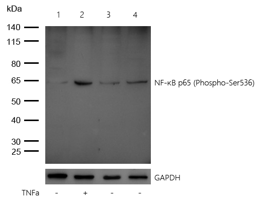 特异性Phospho-NFκB-p65 (S536) Antibody detects endogenous levels of NFκB-p65 protein only when phosphorylated at S536.