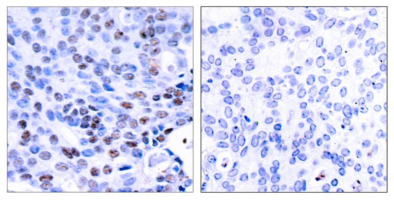 Immunohistochemical analysis of paraffin-embedded human breast carcinoma tissue using NFkB-p105/p50(Ab-337) Antibody (left) or the same antibody preincubated with blocking peptide(right).