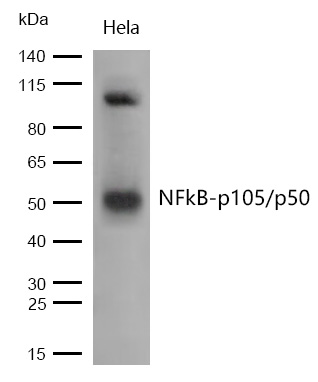 Western blot analysis of extracts from Hela cells using NFkB-p105/p50 Antibody.