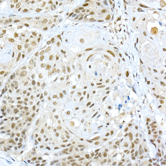 Immunohistochemistry analysis of paraffin-embedded Human esophageal cancer using CREB Antibody at dilution of 1:50 (40x lens).
