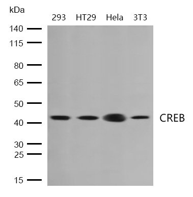 Western blot analysis of extracts from 293, HT29, Hela and 3T3 cells using CREB Antibody.