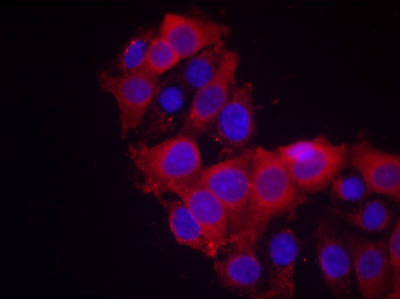 Immunofluorescence staining of methanol-fixed MCF cells using VEGFR2 Polyclonal Antibody. Blue: DAPI for nuclear staining.