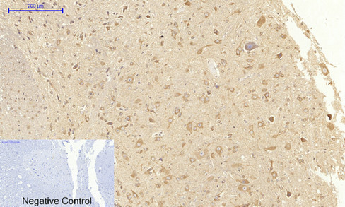 Immunohistochemical analysis of paraffin-embedded Rat spinal cord tissue using VEGFR2 Polyclonal Antibody.Negative control was used by secondary antibody only.