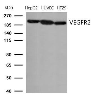 Western blot analysis of extracts from HepG2, HUVEC and HT29 cells using VEGFR2 Polyclonal Antibody.