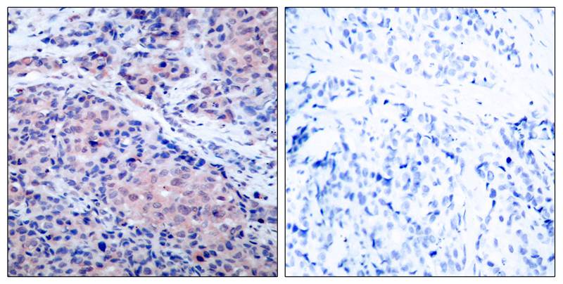 Immunohistochemical analysis of paraffin-embedded human breast carcinoma tissue using IkB-a Antibody(left) or the same antibody preincubated with blocking peptide(right).