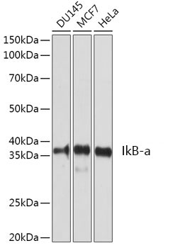 Western blot analysis of extracts from DU145, MCF7 and Hela cells using IkB-a Antibody.