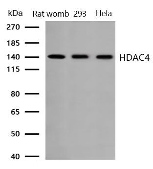 Western blot analysis of extracts from Rat womb, 293 and Hela cells using HDAC4 antibody.