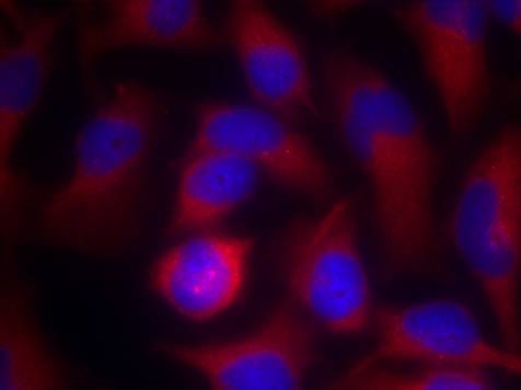 Immunofluorescence staining of methanol-fixed Hela cells using PAK1 Polyclonal Antibody.DAPI for nuclear staining.
