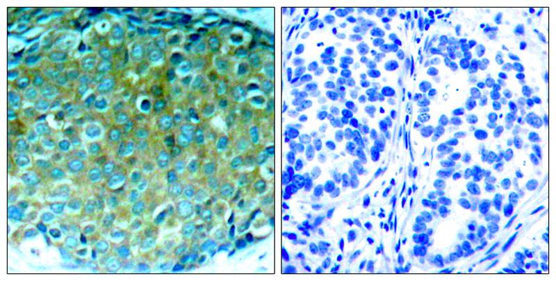 Immunohistochemical analysis of paraffin-embedded Human breast carcinoma tissue using PAK1 Polyclonal Antibody(left) or the same antibody preincubated with blocking peptide(right).