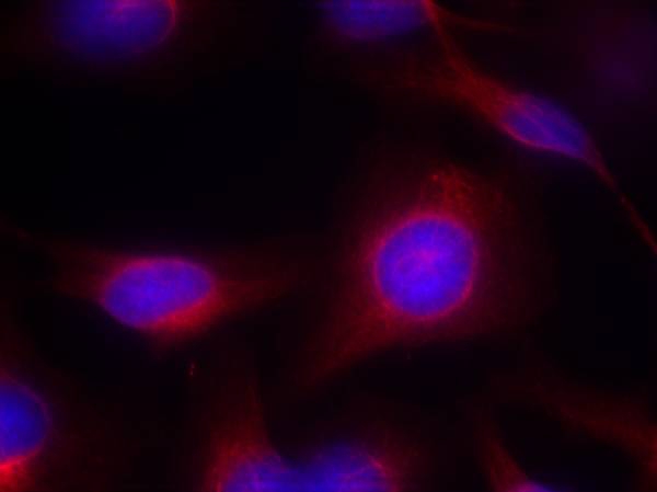 Immunofluorescence staining of methanol-fixed Hela cells using MEK1/MEK2 Antibody.