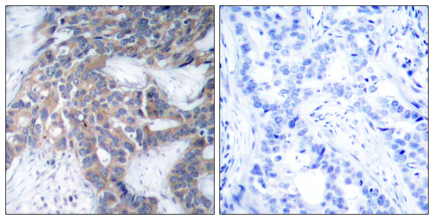 Immunohistochemistry analysis of paraffin-embedded human breast carcinoma using MEK1/MEK2 Antibody. The picture on the right is blocked with the phospho peptide.