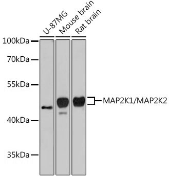 Western blot analysis of extracts from U-87MG cells, Mouse brain and Rat brain using MEK1/MEK2 Antibody.