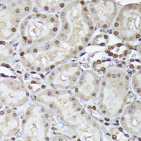 Immunohistochemistry analysis of paraffin-embedded Rat kidney using P38 MAPK Antibody at dilution of 1:100 (40x lens).