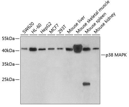 特异性The antibody detects endogenous level of total P38MAPK protein.