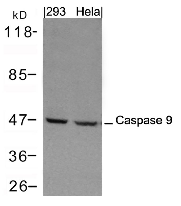 Western blot analysis of extracts from 293 and Hela cells using Caspase-9 Antibody.