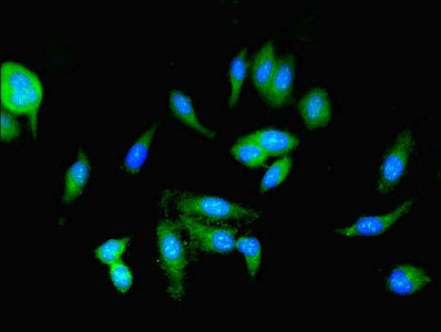 Immunofluorescence staining of methanol-fixed Hela cells using PKM1 Antibody.Blue: DAPI for nuclear staining.