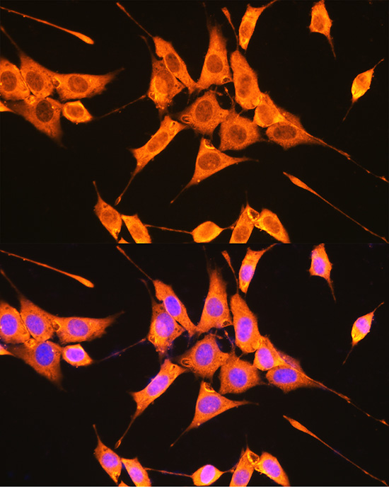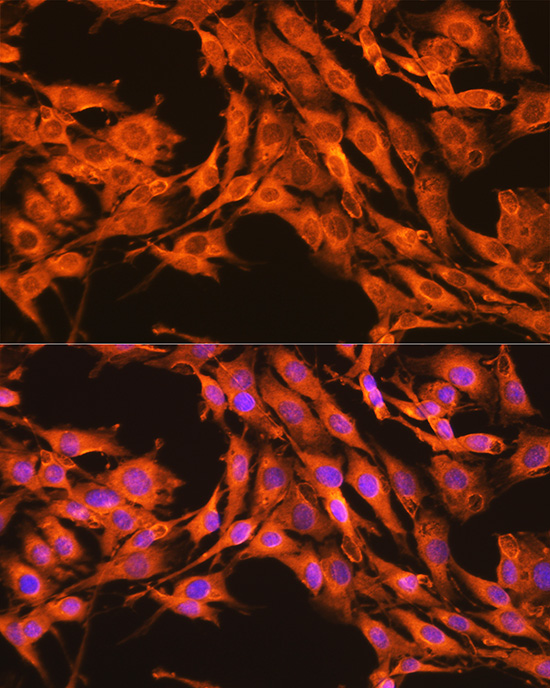 Immunofluorescence staining of methanol-fixed NIH-3T3 cells using PKM1 Antibody.Blue: DAPI for nuclear staining.