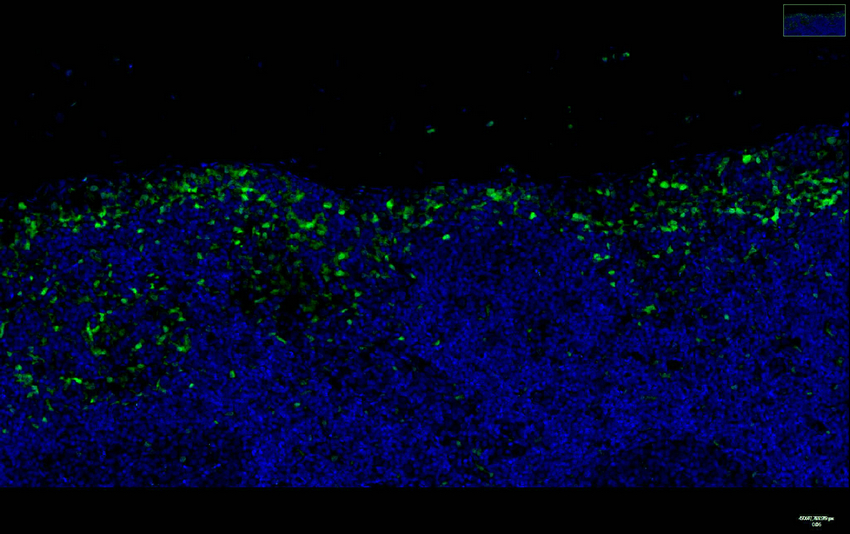 Immunofluorescence analysis of Rat Mesenteric lymph nodes using P38 MAPK Antibody (green).