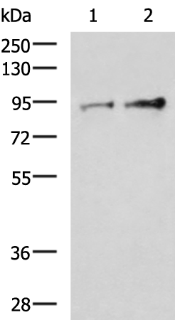 Gel: 8%SDS-PAGE, Lysate: 40 μg, Lane 1-2: Jurkat and Ramos cell lysates, Primary antibody:TTC14 Antibody at dilution 1/1000, Secondary antibody: Goat anti rabbit IgG at 1/5000 dilution, Exposure time: 5 minutes