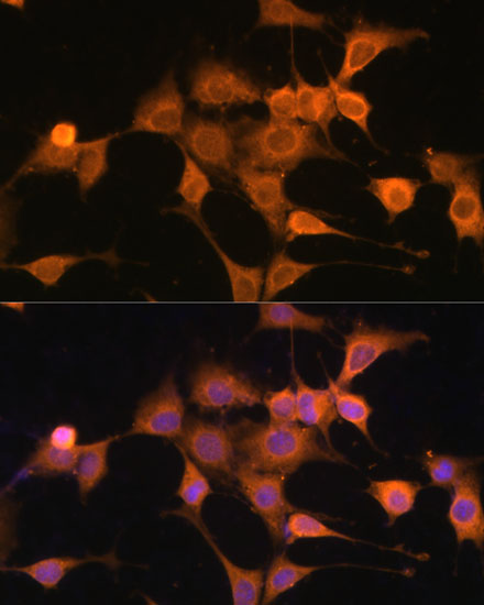 Immunofluorescence analysis of PC-12 cells using BAX antibody at dilution of 1:100. Blue: DAPI for nuclear staining.