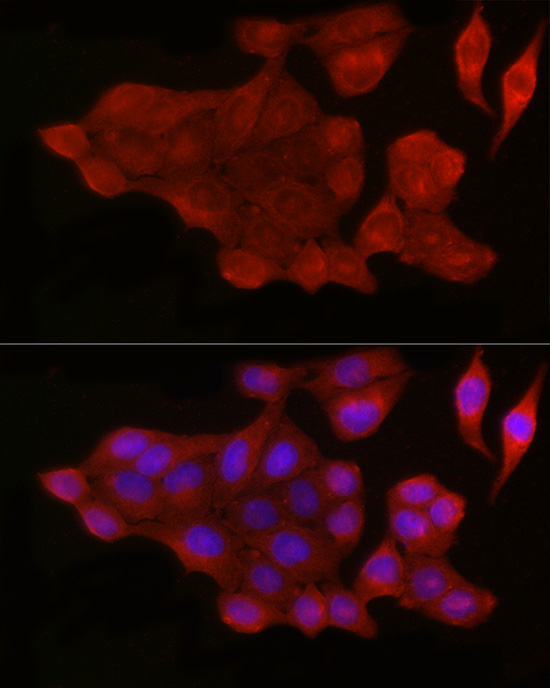 Immunofluorescence analysis of HeLa cells using BAX antibody at dilution of 1:100. Blue: DAPI for nuclear staining.