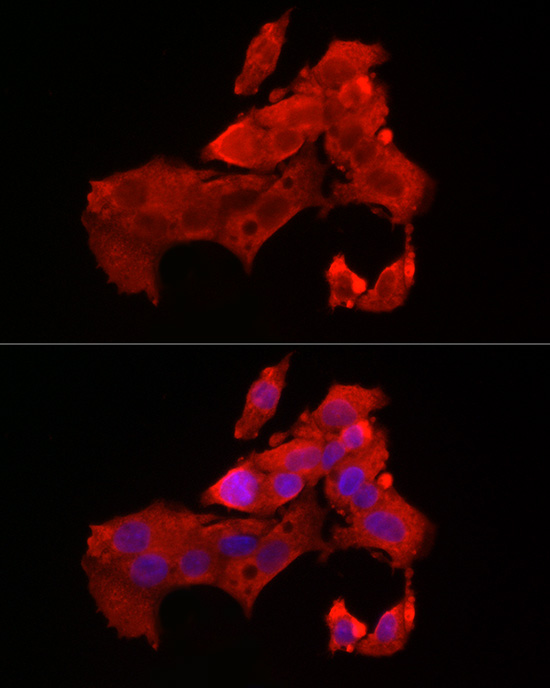 Immunofluorescence analysis of NIH/3T3 cells using BAX antibody at dilution of 1:100. Blue: DAPI for nuclear staining.