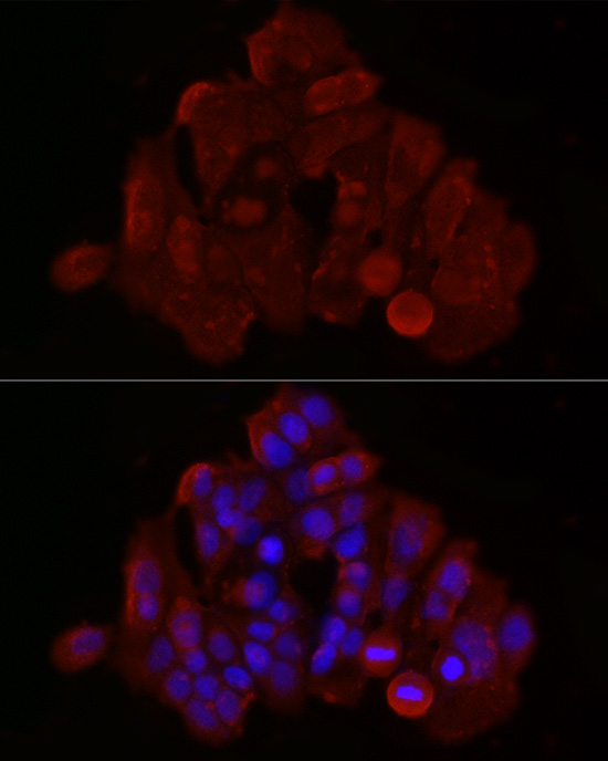 Immunofluorescence analysis of MCF-7 cells using BAX antibody at dilution of 1:100. Blue: DAPI for nuclear staining.
