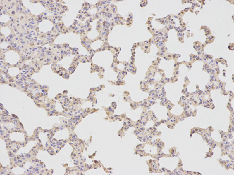 Immunohistochemical analysis of paraffin-embedded rat lung using FABP4 antibody at dilution of 1:200 (200x lens).