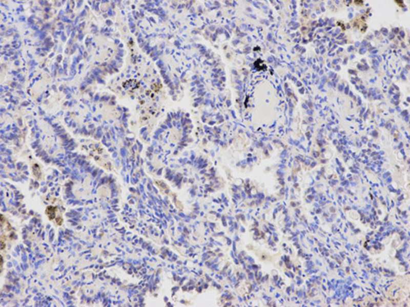 Immunohistochemical analysis of paraffin-embedded human lung cancer using FABP4 antibody at dilution of 1:200 (200x lens).