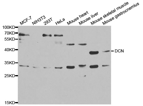 Western blot analysis of extracts of various cell lines, using DCN antibody.