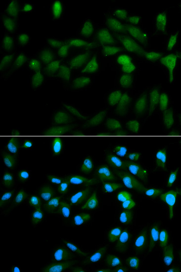 Immunofluorescence analysis of MCF7 cell using CYP11A1 antibody. Blue: DAPI for nuclear staining.