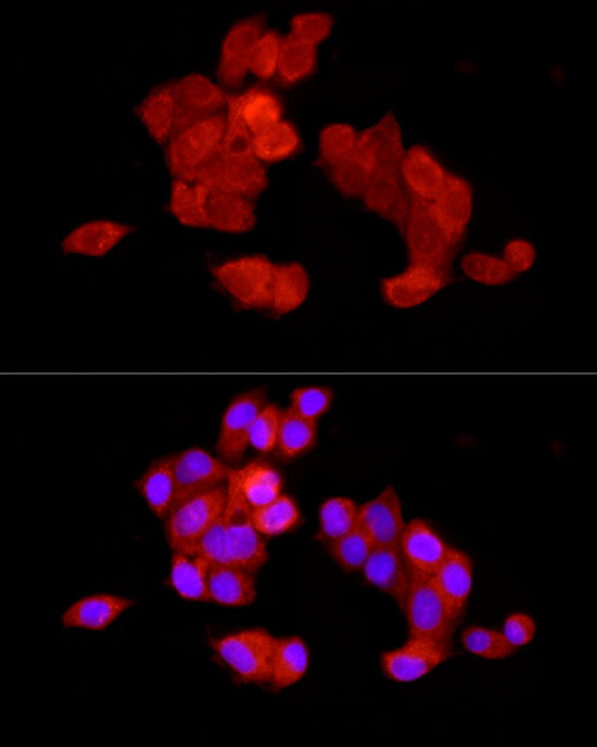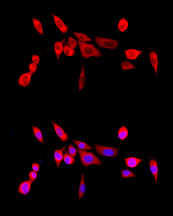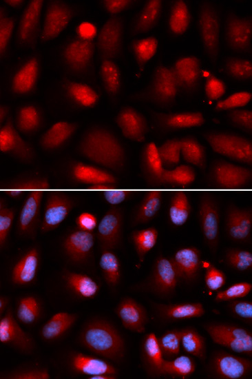 Immunofluorescence analysis of U2OS cell using P65 antibody. Blue: DAPI for nuclear staining.
