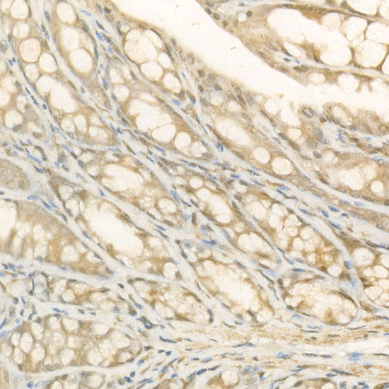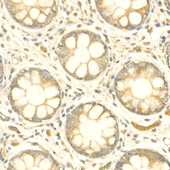 Immunohistochemistry analysis of paraffin-embedded Human colon using p65 Rabbit pAb at dilution of 1:200 (40x lens).