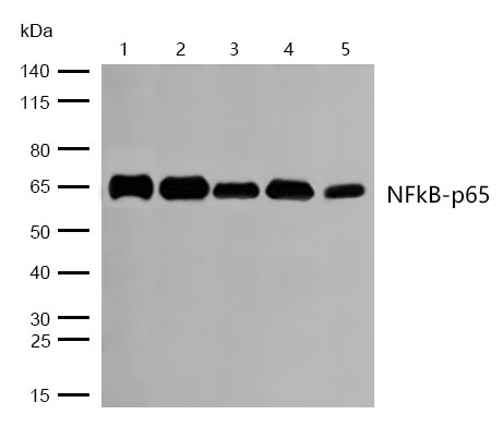 Western blot analysis of lysates from various cell lines using NFkB-p65 Antibody. Lane1: Jurkat Lane2: BT-474 Lane3: Mouse lung Lane 4: Mouse liver Lane5: Rat lung