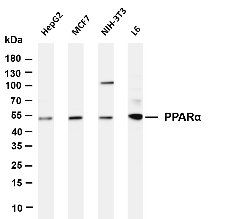 Various whole cell lysates were separated by 4-20% SDS-PAGE, and the membrane was blotted with PPARA antibody. The HRP-conjugated Goat anti-Rabbit IgG(H + L) antibody was used to detect the antibody. Lane 1: HepG2 Lane 2: MCF7 Lane 3: NIH-3T3 Lane 4: L6 Predicted band size: 52kDa Observed band size: 52kDa