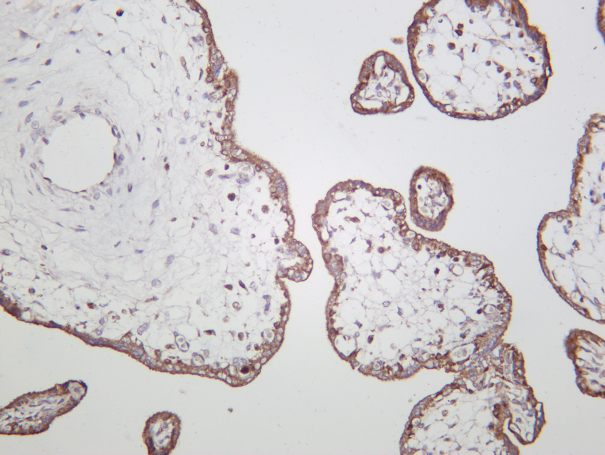 Immunohistochemistry of paraffin-embedded Human placenta tissue using Adiponectin Polyclonal Antibody.