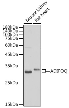 Western blot analysis of extracts from Mouse kidney and Rat heart using Adiponectin Polyclonal Antibody.