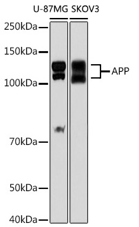 Western blot analysis of extracts from U-87MG and SKOV3 cells using APP antibody.