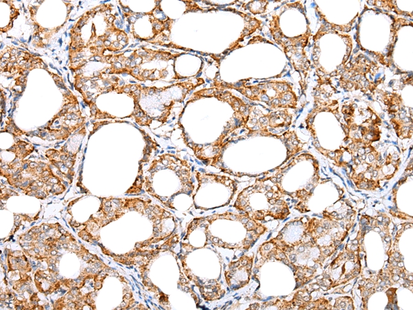 Immunohistochemical analysis of paraffin-embedded Human thyroid cancer tissue using #42709 at dilution 1/20.