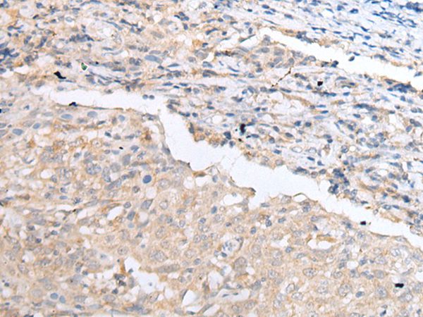 The image on the left is immunohistochemistry of paraffin-embedded Human cervical cancer tissue using CCR4 Antibody at dilution 1/20, on the right is treated with synthetic peptide. (Original magnification: x200)