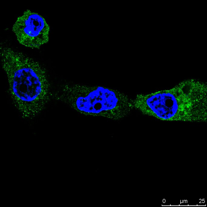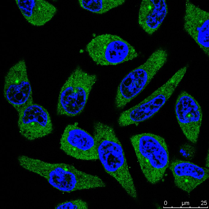 Immunocytochemistry analysis of Hela cells with FAM38A at 1/100 dilution.