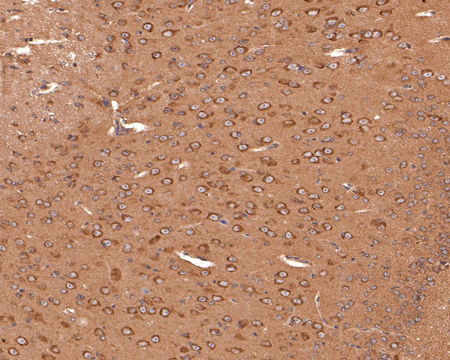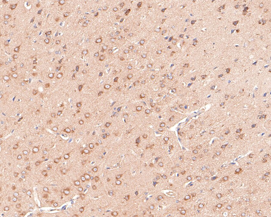 Immunohistochemical analysis of paraffin-embedded rat brain tissue with FAM38A at 1/600 dilution.