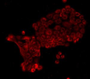 ICC staining E-Cadherin in A431 cells (red). Cells were fixed in paraformaldehyde, permeabilised with 0.25% Triton X100/PBS.